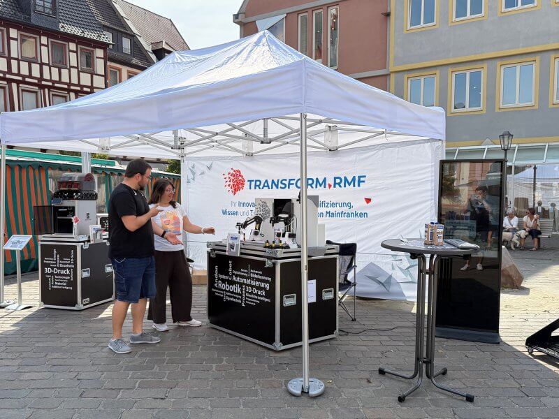Technologie erlebbar machen: Hierfür hat das Team des Verbundvorhabens der Technischen Hochschule Würzburg-Schweinfurt (THWS) und der Region Mainfranken GmbH „transform.RMF“ mit einem Infostand die Orte Veitshöchheim, Karlstadt und Kreuzwertheim besucht. Bereits zum 20. Mal ist das Team des Innovationsnetzwerks für Qualifizierung, Wissen und Technologie bislang unterwegs gewesen, um den direkten Kontakt zwischen Wissenschaft, Gesellschaft, Technologie und Wirtschaft zu fördern.